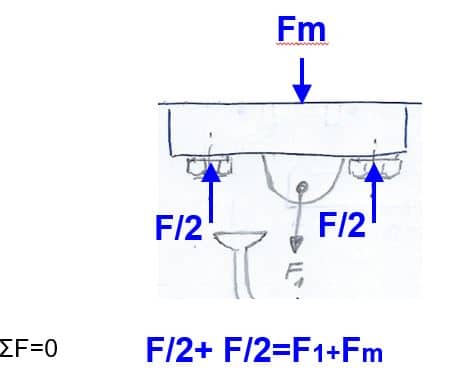 נתחיל להפעיל כוח F1 קטן, ונלך ונגביר אותו. הקפיצים לא יתכווצו ואתם המכסה/פקק לא ימוש ממקומו, עד שהכוח  F1  ישווה לF, הוא כוח הדריכה. עד שזה יקרה (וכל עוד אין נתק בין המכסה למכל), כל תוספת של  F1, תקטין באותה מידה את הכוח שמופעל על המכסה מצד המכל. וכמה מפתיע! הקפיצים ימשיכו להפעיל על ראשי הברגים, את אותו הכוח- שהרי אורכם של הקפיצים לא ישתנה (אמרנו שהם אינם מתכווצים עד הנתק ונזילת המים).