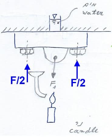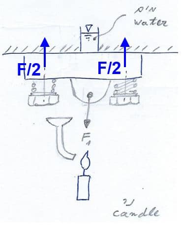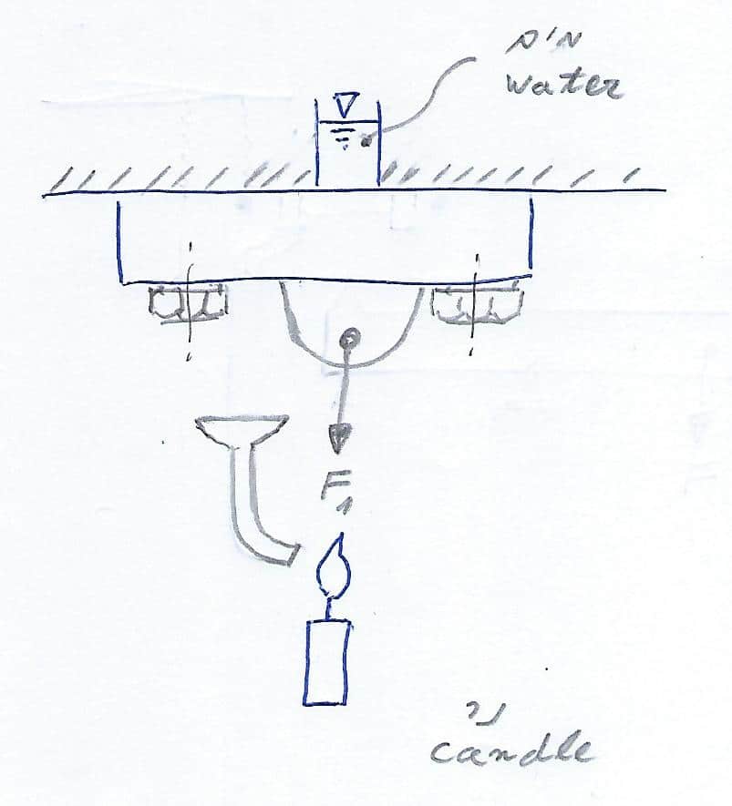 ולהמחשה, נחקור את המכונה המיוחדת לכיבוי הנר שלפננו. בלב המכונה, חיבור ברגים של פקק לתחתית מכל מים. ברגע שחפץ המשתמש לכבות את הנר, הוא צריך להפעיל כוח  F1  במקום המתאים, רווח יווצר בין המכסה (פקק) ותחתית המכל, מים יזרמו דרך מערך הצנרת, ישר אל להבת הנר, והנר יכבה: