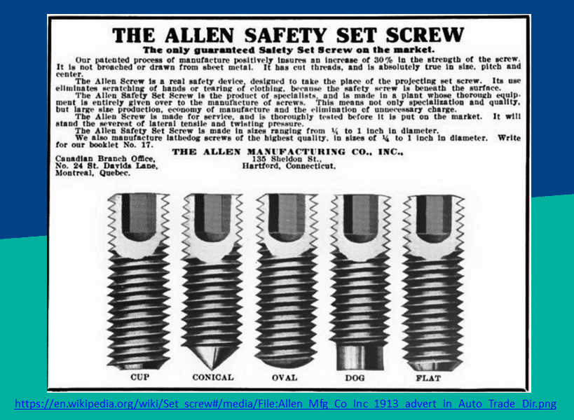 הבורג הצדי הסמוי (הנפוץ) הוא המצאה בת יותר ממאה שנה. בתמונה פרסום משנת 1913:
