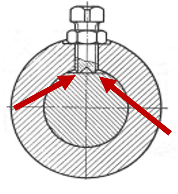 אך המרחק הקטן בין נקודות המגע של פני הבורג עם המשטח (הישר) הנגדי יגרום להתפתחות לחצים עצומים בנקודות המגע (המודגשות בחיצים האדומים) וכניעה פלסטית על המשטח של הציר או בפני הבורג. מכאן ועד להתרופפות החיבור כולו, המרחק קצר, במיוחד אם התנועה הסיבובית המועברת אינה קבועה או מחליפה כיוון.