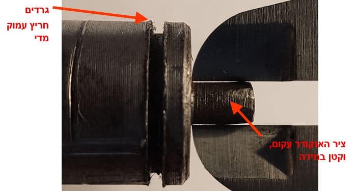 הציר מעובד גס, הקצה שמתחבר לאנקודר הסיבובי- עקום ובמידה קטנה, החריץ לסירקליפ עמוק מידי ועם גרדים: