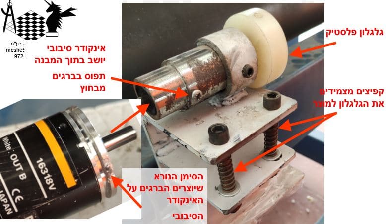 אם נסתכל על הרכבת גלגלון הפלסטיק בצד ימין של הציר, נראה שהוא מצומד לציר ע”י הבורג הרדיאלי (אלן ללא ראש) שנצמד לציר, חורץ בו סימן, ואוחז בו. אם ישתחרר קצת בורג זה, לא תועבר תנועה (מומנט) לציר, כי הבורג שבראש הציר (צד ימין) אינו אוחז בגלגל. הבורג רק משמש גובל ימני לגלגל. אין לו שום תרומה להעברת המומנט.
