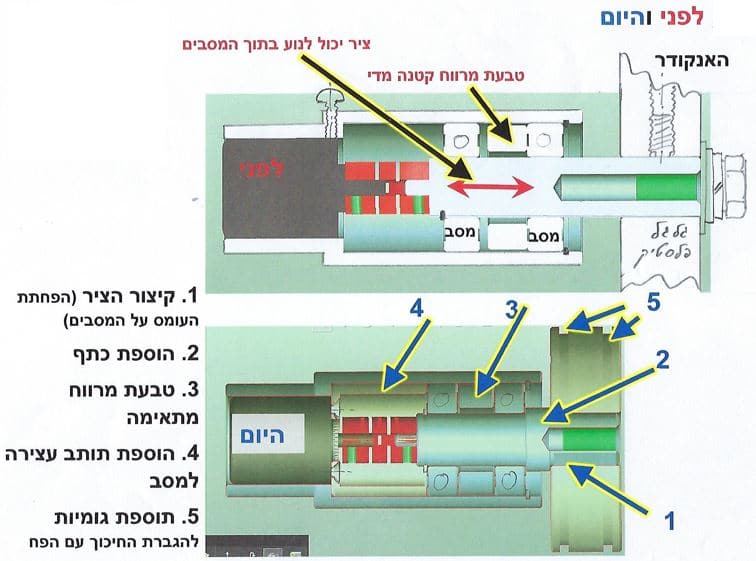 ציר חדש, במידות וטיב שטח משופרים, כתף תומכת לגלגלון כך שהבורג ילחץ את הפלסטיק כנגד הכתף, והחיכוך יעביר את המומנט לציר (אפשר להדק את בורג האלן הרדיאלי גם כן כי הוכן משטח מכורסם על הציר).